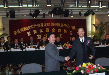 2004年11月22日,由四川理工学院和自贡高新区共同筹建的创业服务中心(筹)成立暨孵化器合作协议签字仪式在汇东大酒店举行。市委常务副书记梁国定、副市长石岷嘉、我院党委书记游建军、党委副书记唐建禾、副院长谢峰、科技处处长李可彬、副处长刘录明参加了签字仪式。