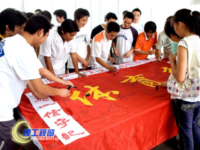 6月7日中午,体育系2003级70多名毕业生在营盘校区运动场进行了毕业生文明离校签字仪式,70多名同学在“牢记八荣八耻、不忘诚信守纪”的红旗上庄重地签上了自己的名字,并纷纷表示要遵守学院规章制度,在离开学院最后的日子里做一名诚信、守纪的学生,做到文明离校,以良好的精神面貌步入社会,接受社会的检验。