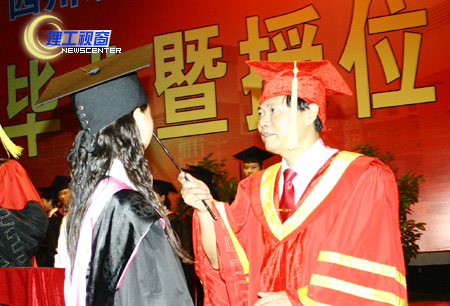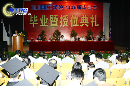 6月24日我院2006年毕业生毕业暨授位典礼在营盘音乐演播厅隆重举行。今天是个特别的日子,我院理学、工学、经济学、法学、管理学、文学的毕业生们,身着庄重典雅的学士服闪亮登场。党委书记游建军、院长曾黄麟、党委副书记唐健禾、党委副书记李开世、副院长邓起方、副院长钱维新、龚敏身着红色的导师服,在《毕业歌》、《毕业生》激昂优扬旋律中渲染出一派节日的气氛。整个会场在红色幕景、海棠、五色玫花盆环衬托涌下热烈而喜气。