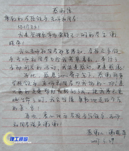 当明星敏副书记和王红旗科长将爱心捐款和部分同学以拾废旧物卖得的现金交到谢晓萍同学及其父母手中时,向他们一家表达了学院领导及师生对她病情的关心和牵挂,嘱咐她要安心治疗,并积极为她提供一些可以寻求帮助的途径和方法。谢晓萍一家人对此感激万分,面对着这浓浓的关爱,这一家淳朴老实的庄稼人,只能以朴实的话语,简单而热情的方式款待远到而来的客人。而谢晓萍同学则将自己的感恩之心寄于笔下,当即写下一封发自肺腑的感谢信:感谢学院的领导、老师、同学们的关心,自己一定不辜负大家的心愿,好好治病,争取早日回到学校,以优异的学习成绩来回报学校,回报社会,回报关心自己的每一个好心人。