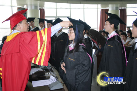 4月14日下午,学院首次举行成人高等教育学士学位授位典礼,为我院成人教育学院2004级13名获得学士学位的同学颁发证书。倪士文等13名获得学士学位的同学身穿学士服,愉快地从副院长钱维新、龚敏手中接过了学位证书。