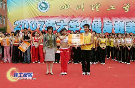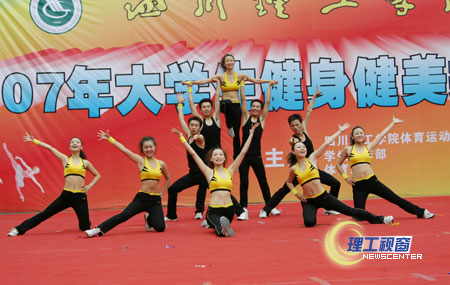 5月16日下午,由体育运动委员会主办、学生工作部、体育系承办的我院“2007年大学生健身健美操比赛”在汇东校区喷泉广场举行。学院副院长、院运动委员会主任龚敏、党委宣传部部长吴斌、院团委副书记王建琼、各系部相关领导出席并观看了比赛。