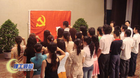 会议在《国际歌》歌声中拉开了序幕。随后进行新党员宣誓,在领誓人总支委员陈泉的带领下,29名新党员胸佩党徽,高举右手,站在鲜红的党旗下庄严宣誓。