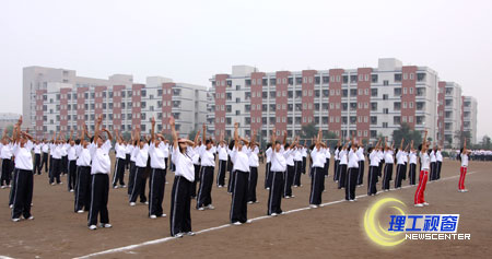 在营盘校区参加这次比赛共有8个系,每个系有120名的同学参加,都展示出了自己的风采。来自中文系“自强不息,止于致善,扬我理工,校兴我荣”的口号赢得了现场师生们的一阵阵喝彩。体育系和音乐系同学的标准整齐的动作也赢得了热烈的掌声。