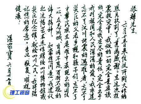 六月十五日来信及所附大作的照片收到了,甚为感谢。在这次抗震救灾中,我做的一切完全是应该的,完全是我应尽的责任,完全出于我对祖国和人民深深的爱。我永远忘不了,汶川地震的遇难者,忘不了灾区的父老乡亲和孩子们,忘不了中华民族在危难中表现出的团结一心、众志成城、自强不息、百折不挠的伟大精神。如蒙您同意,我建议把这幅艺术杰作赠给四川博物馆或灾区纪念馆,献给四川人民。我将铭记您的厚意。专此,敬复。顺祝健康!