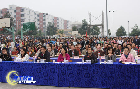 11月12日下午,我校纪念改革开放三十周年大学生歌咏比赛在汇东校区篮球场举行。全校13个二级学院和基础教学部、体育部以及研究生院分别派代表队参加了比赛。学校党政领导游建军、唐健禾、李开世、刘康、蔡乐才和各二级学院(部)以及相关职能部门的领导观看了比赛。