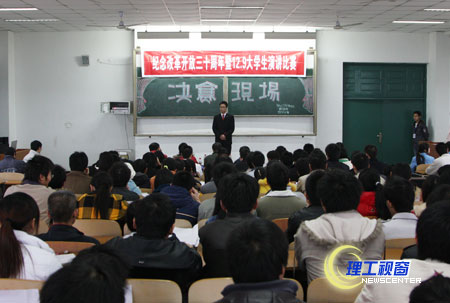 由党委学生工作部(处)、校团委主办的“纪念改革开放三十周年暨12•9”大学生演讲比赛决赛于12月10日在汇东校区厚德楼404教室举行,党委组织部部长罗成芳、党委统战部部长邱仲平以及学生处、团委的相关领导观看了比赛并担任比赛评委。