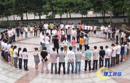 下午2点28分,艺术学院部分师生及参观海报的部分观众在营盘校区中心花园举行简单仪式,为地震死难者默哀,为灾区人民祈福。