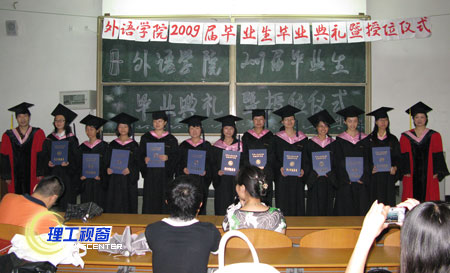 6月25日,外语学院在厚德楼106教室隆重举行了“外语学院2009届毕业生毕业典礼暨授位仪式”。外语学院的有关领导、老师及外语学院2009届本科毕业生出席了毕业典礼暨授位仪式,典礼由外语学院党总支副书记吴春容主持。
