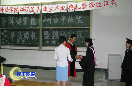 在欢乐的《欢乐颂》乐曲声中,外语学院院长夏宏钟、党总支书记廖国强、副院长云虹三位教授为身穿文学学士服的毕业生一一授位、扶流苏。手捧学位证书,身穿学士服的毕业生与授位的教授一一合影留念,将最美最灿烂的笑容定格在照片中也定格在了毕业生们内心深处的记忆中。典礼在轻快的《毕业歌》歌声中圆满结束。
