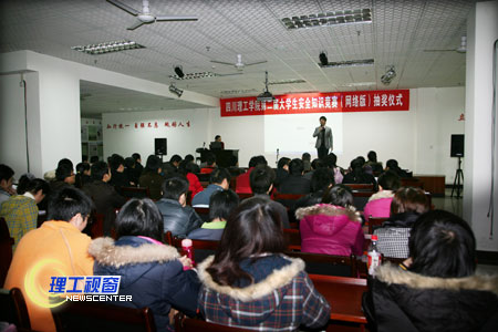 12月9日下午,学校第二届大学生安全知识竞赛(网络版)抽奖暨颁奖仪式在科学会堂学生就业指导中心举行。有关部门和二级学院的负责人分别通过网上随机抽取的方式分别抽取了一等奖2名、二等奖5名、三等奖10名以及优秀奖20名,并为获得优秀组织奖的二级学院(部)颁发了荣誉证书。通过现场抽奖,生工学院生物技术及应用专业2007及2班的李丽、材化学院工艺专业2008级2班的曾佑强荣获一等奖,计算机学院计算机科学与技术专业2008级1班的郑华等5名同学荣获二等奖,经管学院市场营销专业2008级1班刘洪寿等10名同学荣获三等奖,化药学院制药工程专业2008级3班的张智等20名同学荣获优秀奖。