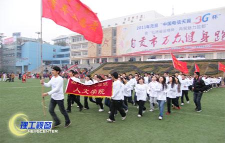 1月1日上午9时,人文学院健儿参加自贡市举行的2011年“弘扬省运精神,再展魅力盐都”迎新年万众健身长跑活动。来自机关、企事业单位、学校、社区、乡镇的群众健身队伍,自贡军分区的指战员和武警官兵以及青年志愿者120个长跑方队,在健身跑活动中一展风采。