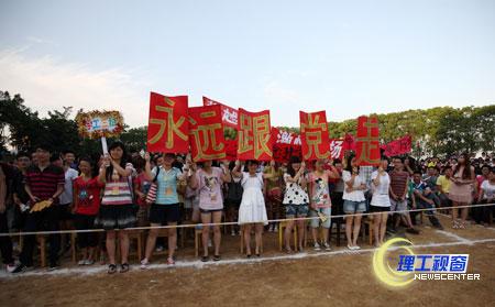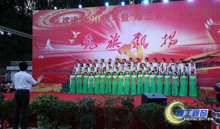 6月24日晚7:30,黄岭校区管委会、基础教学部主办的“党旗飘扬”——庆祝中国共产党成立九十周年暨“难忘黄岭”文艺晚会在黄岭校区足球场隆重举行。学校党委书记游建军、副院长龚敏、副院长刘康、副院长王成瑞以及各二级学院、各职能部门的领导莅临黄岭校区观看演出。晚会开始前,现场的气氛就已经被各学工组热情的拉歌比赛点燃,在一声声“团结就是力量”的歌声中,晚会正式开始。