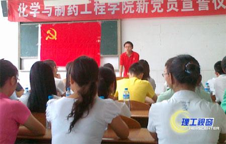大会在嘹亮的《国际歌》歌声中拉开序幕,44名新党员在化学系学生支部书记杨秀英老师的带领下,面对党旗宣誓。宣誓完毕后,党总支书记李敏娇教授发表讲话,她对各位新党员表示了热烈的欢迎和衷心的祝贺,同时也给新党员大家提出要坚定共产主义理想信念,牢固树立正确的世界观、人生观和价值观;要充分发挥先锋模范作用,为党旗增辉添彩;要严格遵守党的纪律,积极参加组织生活等要求。党员代表龙冬同学、积极分子代表陈坤同学分别发表了讲话,他们都表达了对党的热爱和拥护,并表示会用实际行动来证明入党的决心。