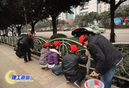3月2日下午,一群头戴红色小帽的志愿者出现在丹桂大街,他们有的弯腰用钳子捡垃圾,有的负责用水桶接水,还有的用擦布擦洗街道两边的防护栏……他们分工明确,一切都井然有序。初春的三月,还夹杂着丝丝寒意,可同学的心却是热乎乎的。他们是我校各学院的学生干部、党员和优秀团员等组成的学生志愿者。