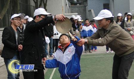 活动在嘹亮的团歌中拉开序幕。首先,盲聋哑学校的领导为天爱艺术团的英语志愿者颁发了聘书。紧接着便是聋哑学生的手工艺品展示,精美的十字绣、娟秀的画作,如此丰富的才艺,深深地感动了我们。伴随快乐的歌声,本次活动的游戏总动员也正式开始了,踩气球、“保龄球”、敲锣和一分钟跳绳,同学们用心的根据盲聋哑人的特点设计每个游戏环节。