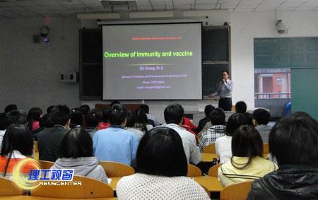 3月29日晚,由化学与制药工程学院主办的博士论坛讲座——Overview of Immunity and Vaccine(免疫与疫苗概述)在厚德楼204教室开讲,主讲人为化药学院张智博士,化药学院师生及部分其他学院师生参加了讲座。