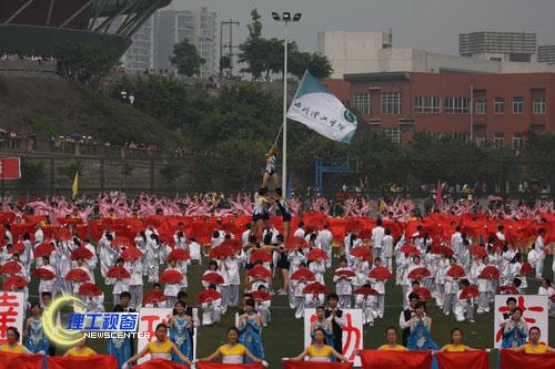 运动员、裁判代表分别宣誓,将本着“友谊第一,比赛第二”和“公平、公正”的原则参加比赛。随后,体育场上2000多人组成的大型团体操表演闪亮登场,为全校师生献上了精彩纷呈的太极排舞、功夫扇、华尔兹和啦啦操组成的团体操表演。矫健优美的舞姿,整齐划一的动作,形象生动的造型激起了全场欢声雷动。团体操融歌曲、舞蹈、武术和体操于一体,表现了由《绚丽青春》、《厉兵秣马》、《畅想理工》、《魅力飞扬》四幕结构的宏伟主题,象征着我校师生振奋精神、鼓足干劲、坚定不移地继续推进四川理工大学建设的豪迈激情和开拓精神。