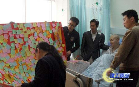 4月8日,黄岭校区管委会、基础教学部学工办副主任钟世友率队,土木工程专业辅导员老师唐林,学生代表何青松、张海悦一行前往成都华西医院,看望该班身患骨癌的吴诗成同学,把师生们的关怀之情和爱心募捐送到了吴诗成手中。