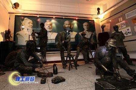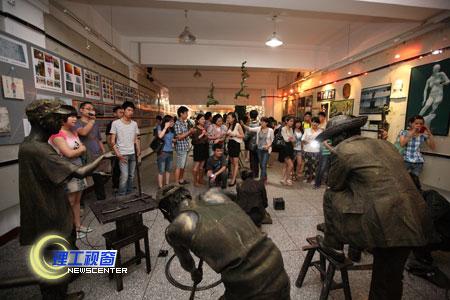学生展厅中陈列的基本上都是学生的日常作品成果,包括浮雕,人物雕塑,茅台镇酒瓶设计雕塑等的展出。展厅的一面墙上还陈列的了关于汇东校区《生命.运动.薪火.永传》大型锻铜浮雕的翻制、锻造及安装阶段的相关图片展示。