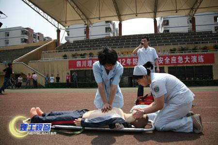 疏散演练结束后,自贡市第四人民医院的医务人员在汇东校区的足球场上为广大师生进行了紧急医疗救护演示。
