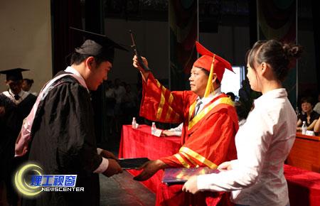 在欢快的乐曲中,学校党政领导为获得表彰的毕业生代表颁发了获奖证书。院长曾黄麟为身着学士服的毕业生代表授予了学位证书,并一一为他们扶流苏。