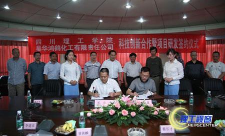 9月13日下午,我校与昊华鸿鹤化工有限责任公司科技创新合作暨项目研发签字仪式在我校举行。校领导曾黄麟、蔡乐才分别与昊华鸿鹤公司董事长、总经理谢学端,副总经理、总工程师郭戈签署了《四川理工学院 昊华鸿鹤化工有限责任公司 战略合作协议》、《聚苯硫醚生产中废液的回收处理》和《甲烷氯化物、PCE等精细产品的应用开发》。