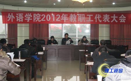 12月12日下午两点,外语学院2012年教职工代表大会在汇东校区行政楼三楼会议室隆重召开。外语学院全体党政领导出席了大会,学院27名教职工代表,4名列席代表,3名特邀代表参加了大会。大会审议了外语学院《2012年外语学院院长工作报告》、《外语学院财务预决算情况通报》、《外语学院绩效工资及人才工程奖励办法实施细则讨论稿》、《外语学院教职工会务及活动管理规定讨论稿》和《四川理工学院外语学院“优秀毕业生”评定办法 (试行)》。