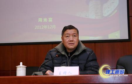 报告会上,周光富以《认真学习贯彻党的十八大精神 不断夺取中国特色社会主义新胜利 》为题,从十八大的主题和历史性贡献、十年基本总结和科学发展观的历史地位、夺取中国特色社会主义新胜利三个方面,对十八大报告提出的新思想、新观点、新论断进行阐述和解读。周光富指出,学习十八大报告要“认清形势看背景、抓住关键看论断、把握重点看新意”,要 树立“忧患意识、创新意识、宗旨意识、使命意识”,要做好“自觉做到坚定理想信念的表率、认真学习实践的表率、坚持民主集中制的表率,弘扬优良作风的表率”。周光富期望全校师生结合自己的学习和工作,把思想统一到十八大精神上来,把力量凝聚到十八大确立的各项任务上去,为建设中国特色社会主义和中华民族伟大复兴提供巨大的人才支撑和智力支持。