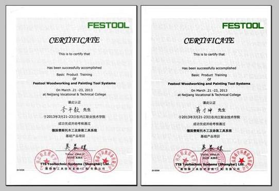 受主办单位德国费斯托工具系统有限公司邀请,艺术学院环境艺术设计教研室主任李平毅老师及蒋才坤副教授于3月21-22日前往内江参加“FESTOOL工具系统设备川渝地区第二期体验式培训班”培训课程。经过学习和实践操作,两位老师成功完成设备操作,并经考核通过,获得“德国费斯托(FESTOOL)木工及涂装工具系统基础产品培训”证书。