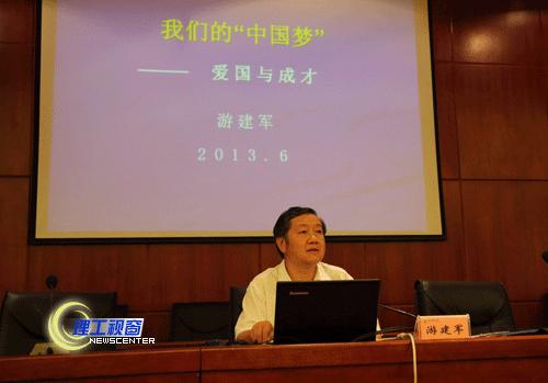 游建军在报告中说,青年大学生的“中国梦”是爱国成才之梦。爱国是中华民族几千年来魂牵梦绕、生生不息的精神支柱。报告通对“天下兴亡,匹夫有责”、等爱国励志名句,和岳飞的《满江红》,毛泽东的《沁园春?雪》等爱国诗词进行了深刻的剖析,还通过图片的方式回忆了2008年奥运会期间海外华人的爱国运动,对比社会主义国家和资本主义国家的历史,对“为什么总有人赞赏资本主义”等现象进行了深刻的剖析;以及通过数据和图片对比的形式回顾了新中国成立以来我们国家取得的巨大成就。报告指出,爱国就是要爱社会主义国家;虽然祖国的发展建设已经取得了巨大的进步,但我们今天依然会遇到种种的不完美、不完善和不完满。但这不仅不是我们埋怨或怨恨国家的理由,相反正是每一个人应该承担起的建设责任。