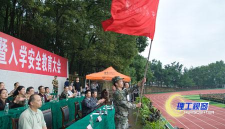 随后,肖兴政代表学校党委行政向军训团授旗,军训团团长俞金良代表军训团接旗。授旗仪式结束后,学校对2013级全体新生进行了入学安全教育。