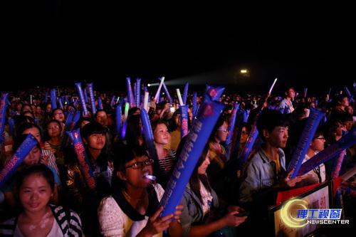 晚上7点,晚会在充满激情活力的舞蹈表演《曙光》中拉开帷幕,演员们动感十足的舞姿瞬间点燃了师生们的激情。在全场观众的翘首期盼和千呼万唤中,因参加台湾第六届《超级星光大道》获得总冠军而一举成名的大陆新生代偶像歌手胡夏闪亮登场。2011年,他因演唱电影《那些年,我们一起追的女孩》的主题曲《那些年》爆红拥有了众多“粉丝”,歌曲横扫台湾、香港、新加坡以及马来西亚等地各大颁奖典礼的奖项。他的登场顿时点燃了全场观众的激情,此次他带来了自己的成名曲《那些年》,引起了歌迷们的共鸣,粉丝们挥舞着手中的荧光棒与胡夏一起纵情歌唱。胡夏用自己独特的嗓音和淡定的舞台表演,演唱了《傻瓜探戈》、《离家以后》、《爱情离我一公尺》、《弹弹琴恋恋爱》等歌迷粉丝们耳熟能详的歌曲,打动了全场观众的心,嗨翻了全场。几位幸运歌迷还上台与胡夏进行了现场互动,并获得了胡夏赠送的签名照片和海报等礼物,与歌星零距离的接触更是艳羡了众多“粉丝”。闪烁的荧光棒、鼓动的加油棒、雷鸣般的掌声、喝彩声此起彼伏,在黄岭校区足球场汇聚成了欢乐的海洋,将晚会推向了高潮。