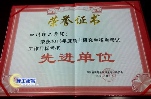 我校在2013年的研究生招生考试工作中严格按照《四川省2013年硕士研究生招生考试目标责任书》的要求,高度重视考风考纪和试卷(答卷)的安全保密工作,认真落实目标责任,措施得力,管理到位,顺利完成了2013年度全国硕士研究生招生考试工作任务,荣获“四川省2013年度硕士研究生招生考试工作目标考核先进单位”。