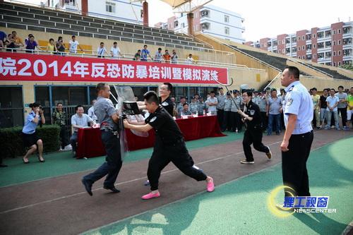 为了进一步强化校园安保工作,增强学校处置突发事件的能力,6月18日下午,学校在汇东校区运动场举行反恐防暴模拟演练,并特邀自贡市公安局反恐处、特警支队、学苑街派出所的民警为保卫处全体人员和学校各部门、各二级学院的安全员以及学生治保干部代表进行了模拟演练培训指导。副院长肖兴政和学生处、团委、后勤总公司、图书馆负责人出席了模拟演练现场。