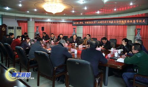 王家贵在会上讲话。他说,刚过完农历乙未年元宵节就迎来了双方合作的一件大喜事。炭黑院和四川理工学院均为1965年建院,今年正好走过了50周年的发展历程;他要特别感谢我校相关专家长期以来对炭黑院科研工作的大力支持和帮助;炭黑院作为中国唯一的炭黑工业研究设计院,在炭黑特种材料方面做了深入研究,他表示今天的签字仪式标志着校企合作将推向一个新的更高的高度,希望双方合作能上一个新的台阶。