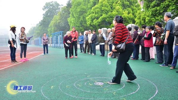 运动会主要包括羽毛球发远、定点投篮、踢毽子、五人队传球、掷沙包、跳绳、铁圈套准等项目。242名参赛者中年龄最小的有60多岁,最大的已经80多岁,可每一个人都精神抖擞,神采飞扬,略显微凉的天气一点也没影响他们的热情,运动会还未开始,便有几位老人在跑道上热身,兴高采烈地谈论自己待会要参赛的项目,精神头一点也不输给年轻人。掷沙包游戏中,一个老人在工作人员的搀扶下加入比赛,她叫邓邦惠,今年已经76岁了,背也弯了,步子也不再灵活,左眼视力差,可她还是坚持要参加套铁圈和掷沙包比赛,她每扔进一个沙包,观战的人群便发出一阵欢呼,不只是为了她的成绩,更为了她这种不服老的精神。邓老师还说,自己为了来参加运动会,还特意带了护腰想把腰支撑起来,脸上明亮的笑容告诉我们,即使年龄大了,她的心依然年轻。