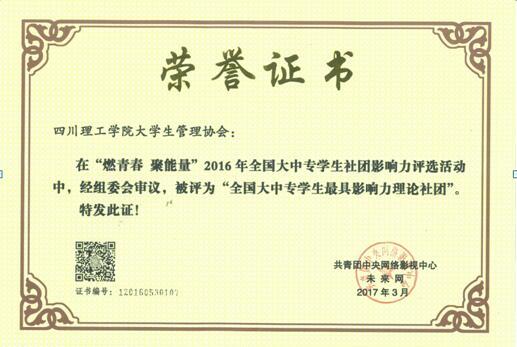 日前,在由共青团中央网络影视中心、团中央未来网组织开展的“燃青春 聚能量”2016年全国大中专学生社团影响力评选活动中,我校大学生管理协会荣获“全国大中专学生最具影响力理论社团”。