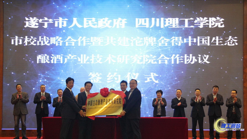 10月23日上午,我校与遂宁市人民政府校地战略合作暨共建沱牌舍得“中国生态酿酒产业技术研究院”合作签约仪式在遂宁市东旭锦江酒店举行。遂宁市委副书记、市长杨自力,遂宁市委常委、副市长罗晖,市政府秘书长付勇,我校党委书记王洪辉、校长庹先国,中国酿酒协会白酒专家委员会技术顾问、中国生态酿酒产业技术研究院专家胡永松,沱牌舍得酒业股份有限公司总经理李强、总工程师王晓平出席签约仪式。学校相关部门负责人和相关专家参加了签字仪式。市委常委、组织部长周鸿主持签约仪式。