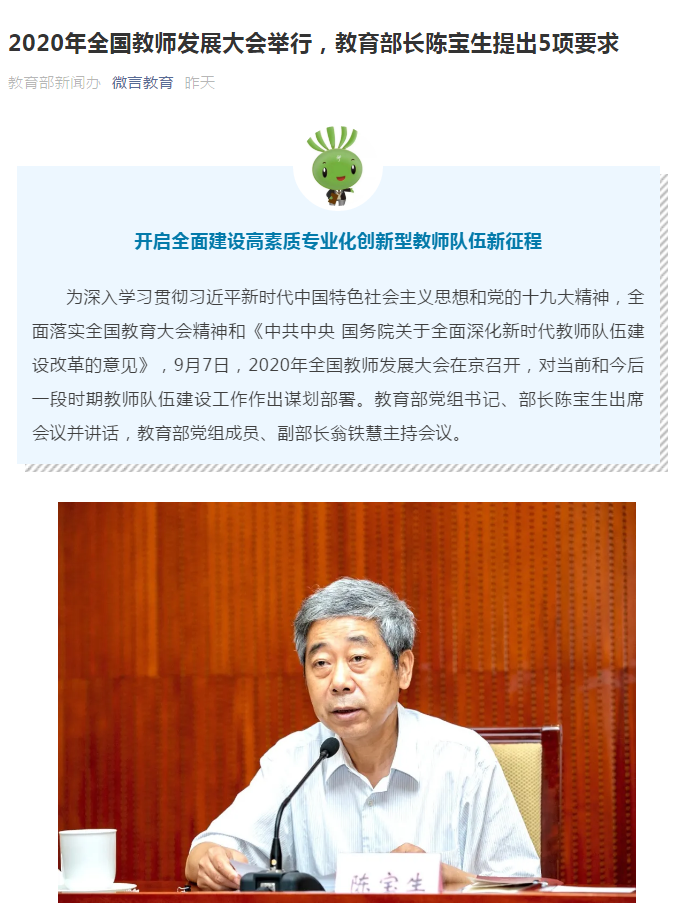 2020年全国教师发展大会举行,教育部长陈宝生提出5项要求