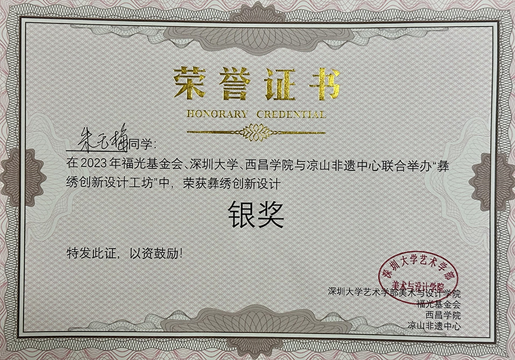 2023年12月14日-17日,研究生导师朱玉梅副教授参加了由福光基金会资助,深圳大学美术与设计学院主持,联合西昌学院艺术学院、凉山非遗中心发起的“福光•非遗创新计划”公益项目。2024年1月15日-20日,项目第一项活动“彝绣创新设计工坊”教学成果——“彝绣创新设计成果展”在西昌建昌•术下美术馆举行。朱玉梅作品“‘云栖’系列饰品设计”荣获银奖。