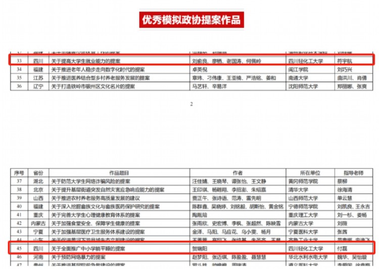 近日,由团中央和全国学联联合开展的2023年全国青少年模拟政协提案征集活动结果公布,我校推送的《关于全面推广中小学躺平睡的提案》《关于提高大学生就业能力的提案》两个作品脱颖而出,获评“全国优秀模拟政协提案作品”,高校组获此殊荣的53件优秀提案作品中,四川省2件获评作品均来自我校。