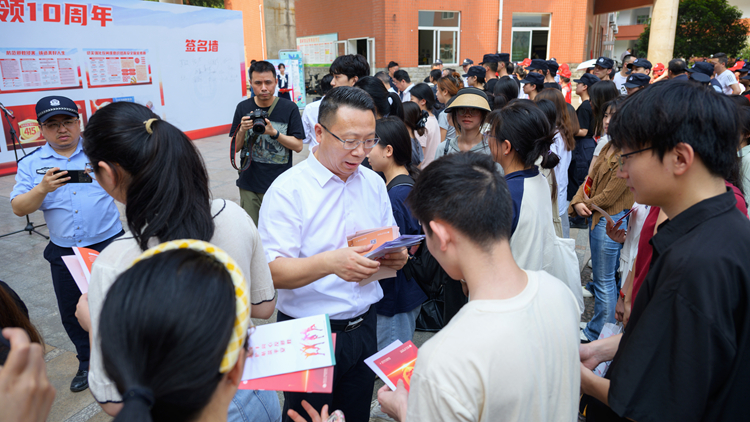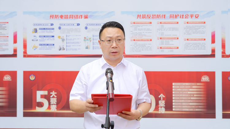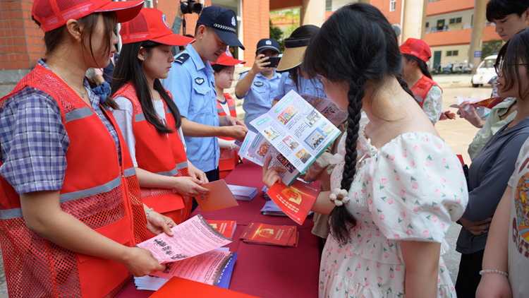 自流井区法院法官、学苑街派出所警官为现场师生发放宣传手册,并结合电信诈骗、反恐、反邪教、反间谍等危害国家安全的生动案例,教育引导师生共筑安全防线,同护校园平安。