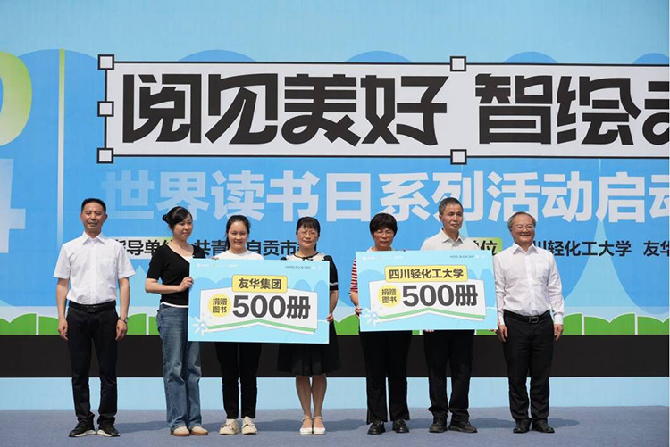 四川轻化工大学学生代表朱智莉以青春之声发出全民阅读倡议,呼吁大家积极参与到阅读中来,共同营造书香校园、书香社会。四川轻化工大学图书馆与友华集团工会共同为高新区红旗街道的7个社区捐赠图书1000册,用于社区“童伴之家”的阵地建设。