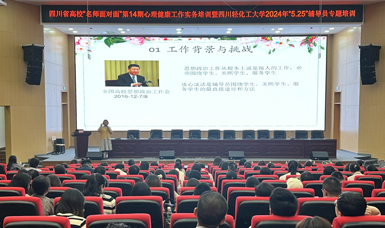 2024年5月9日14时30分,由省心理学会高校心理健康教育专业委员会主办,四川轻化工大学学生工作部(处)承办的四川省高校“名师面对面”第14届心理健康工作务实培训暨四川轻化工大学2024年“5·25”辅导员专题培训讲座在我校宜宾校区举行。教育部高校心理健康教育专业指导委员会委员、电子科技大学心理健康教育中心首席教授李媛到校开展主题讲座。