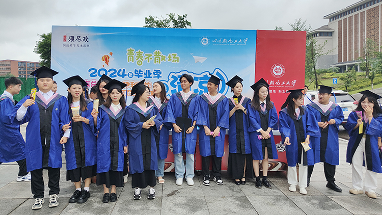 在宜宾校区科学会堂前,在李白河校区盐都大剧院外,校友总会的老师、校友联络协会的同学们和伊利冷饮西南大区川南区域的工作人员一起,热情地将一支支伊利雪糕送到参加典礼的师生手中,现场欢声笑语,热闹非凡。本次“毕业季送清凉”活动现场,师生均可免费品尝伊利雪糕,给炎炎夏日送来清凉,将母校的牵挂和祝福传递给每一位毕业生。