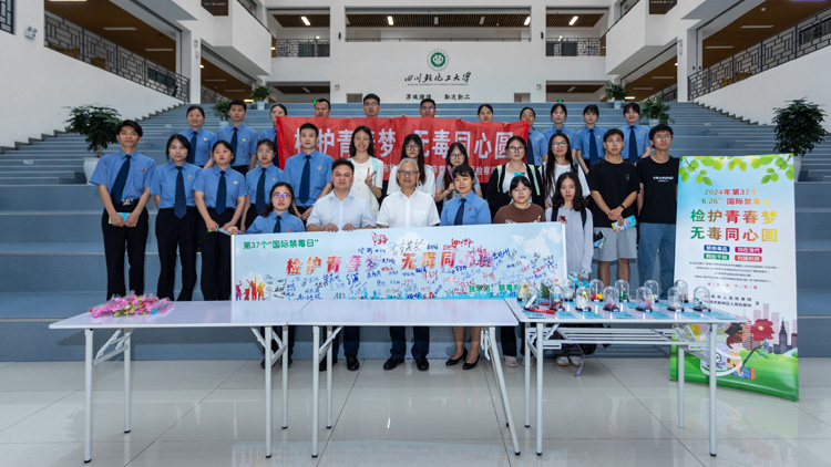 为深入贯彻习近平法治思想和习近平总书记关于禁毒工作重要指示精神,提高师生识毒、防毒、拒毒的意识和自我防护能力,在第37个“6.26国际禁毒日”到来之际,我校在宜宾校区A4-109教室举行了“检护青春梦•无毒同心圆”禁毒宣传暨签名活动。宜宾市人民检察院第二检察部副主任、四级高级检察官袁义聪,部分师生代表参加活动。法学院党委书记杨汉国主持活动。
