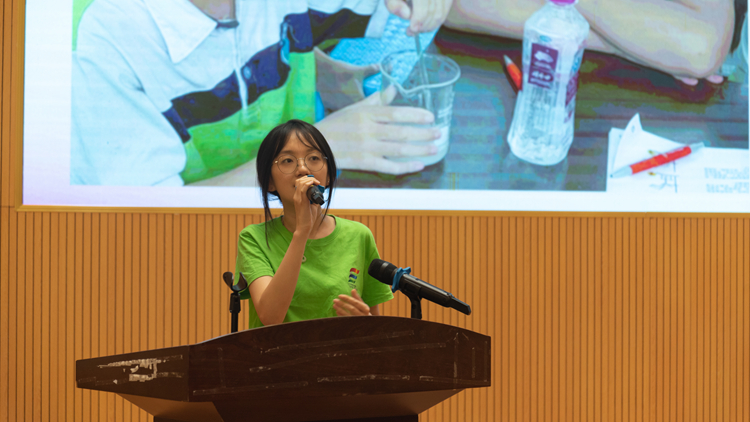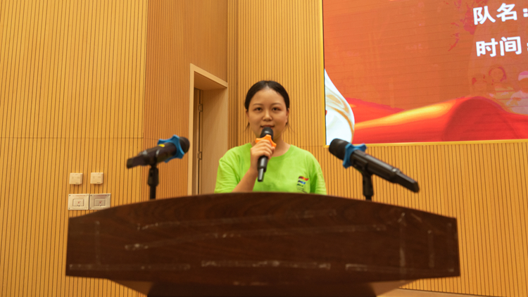 2023年全国大学生暑期实践项目100强——化学工程学院“哇赛童年”七彩假期项目负责人焦乐彤作了交流发言。她分享了团队从爱国主义教育、本土文化传承和科学创新三个角度来开展具体活动的相关情况。