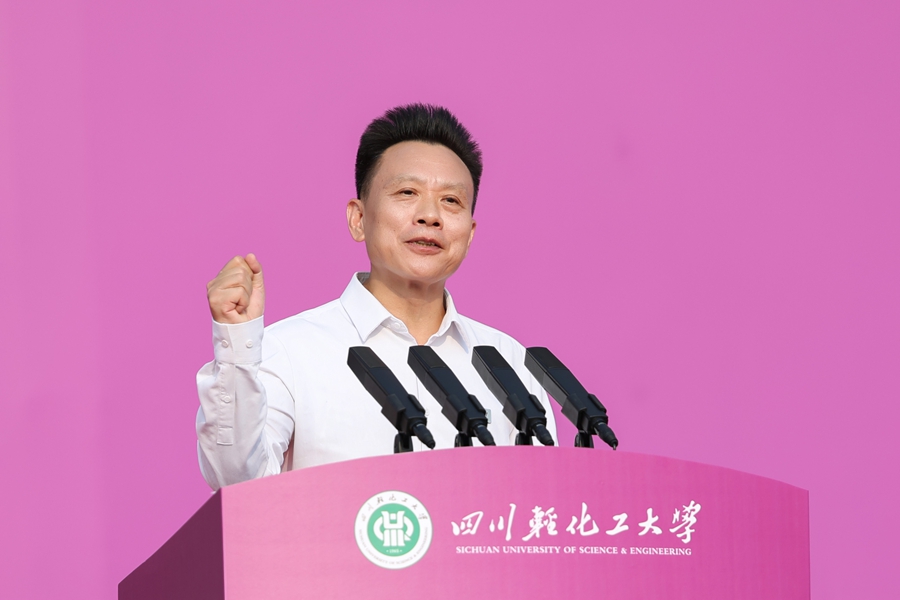 刚过去的暑假,除了等待录取通知书,不少同学还做了最强攻略,想把关于我们大学的情况“一网打尽”。我也不时在网上捞到一些有意思的信息:有同学开启咆哮模式问,“偏要去川轻化什么意思,川轻化到底有谁在啊?!”不少新生闹热地跑来留言,“颤抖吧,出息了,成功上岸川轻化!”也有看热闹不嫌事大的来吃瓜我们的“小徐同学”,“祝贺学长,又可以在川轻化考六次英语六级了。”还有硬夸咱学校的说,“上大分,四川空调电梯大学,孩子老喜欢了。”更有不少耿直孩子许愿,“军训请上点强度,强烈要求一个月!”磕到了,同学们,都是会整活的善良孩子,相信你们对川轻化的选择都将始于颜值、忠于内涵、久于情怀。而你们不知道的是,为了这场甜蜜奔现,川轻化已足足准备了59年——时光如风,跨越山海。回溯至1965年,我校前身华东化工学院(现华东理工大学)的一批师生响应党和国家的号召,从黄浦江畔西迁至沱江之滨,安家自贡黄岭,披荆斩棘、从无到有,铸就“652”工程之根基,涵养我校“胸怀天下之家国情怀,舍我其谁之使命担当,自强不息之开拓奋进”的“652精神”。作为我校“652精神”新的传承者,请所有2024级新生起立、立正,和校长一起来领悟“652精神”内涵。请跟着我大声说:“胸怀天下之家国情怀”(新生念)——“舍我其谁之使命担当”(新生念)——“自强不息之开拓奋进”(新生念)。很好很强大,有被硬控20秒,请坐下。谢谢同学们“秋天里的第一次呐喊”,其中真意,还待你们以后用心与行去细品。乘风跨越,创新前行。弘扬“厚德达理、励志勤工”校训,一代代川轻化人薪火相传、接续奋斗,几度更名、蝶变逆袭,让大家能够在现代科技、艺术时尚的李白河校区和庄严典雅、美轮美奂的“万里长江第一校”宜宾校区之间尽情地citywalk,在校园里就能露营、爬山、看最美的风景,你们就说这city不city啊?还让你们住进有电梯空调、上床下桌、两卫一浴的“梦中情舍”,一住一个不吱声!同风而起,扶摇直上。始终坚持立德树人,努力办好人民满意的教育,无数川轻化建设者和守护者,用青春和汗水、奋斗与牺牲,让这所承载三线建设“西迁精神”的大学扶摇而上,获批成为国家国防科技工业局和四川省人民政府共建高校,拥有总占地面积5500余亩、总建筑面积175万余平米的辽阔天地。你们这一批校园萌新,不用再羡慕别人,已成功解锁能够给你温暖、伴你成长、助你进步的人生良配,今后和川轻化一起用心致敬过去、把握现在、憧憬未来,让爱意和理想在大学里的每一天都充分具象化。
