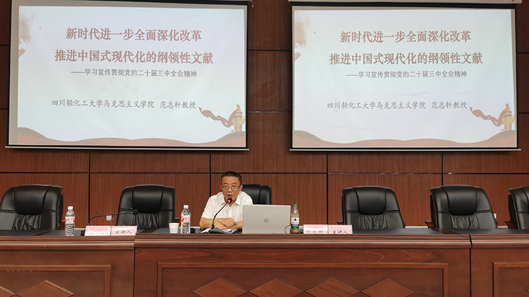 中共宜宾市委宣讲团第九分团(高校宣讲分团)成员、我校马克思主义学院教授范志轩作了题为《新时代进一步全面深化改革、推进中国式现代化的纲领性文献》的宣讲报告。报告从党的二十届三中全会的召开、重要意义、会议主题和《决定》稿的起草过程等方面进行了介绍,围绕准确把握新时代进一步全面深化改革、推进中国式现代化的总体要求,深刻理解新时代进一步全面深化改革、推进中国式现代化的战略部署;全面落实新时代进一步全面深化改革、推进中国式现代化的改革要求等三个方面内容作了全面解读。